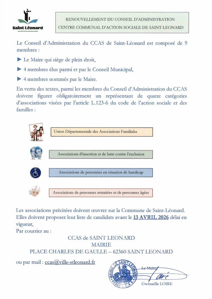 RENOUVELLEMENT DU CONSEIL D’ADMINISTRATION, CENTRE COMMUNAL D’ACTION SOCIALE DE SAINT LÉONARD